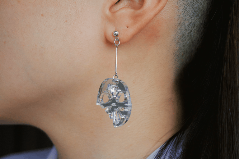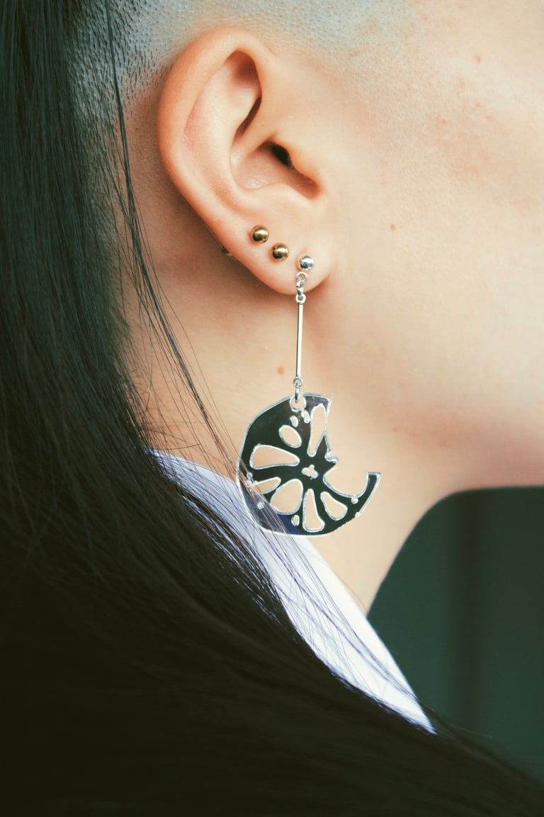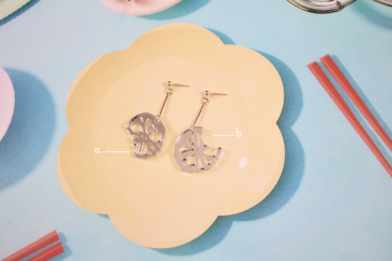 Made with double-sided mirror acrylic using tarnish-resistant silver(rhodium) plated over brass ball posts.